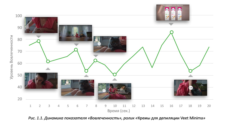 На графиках представлены кривые, которые показывают изменение уровня внимания и вовлечённости во время просмотра рекламного ролика.