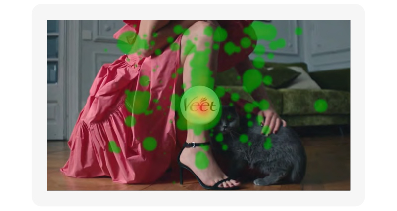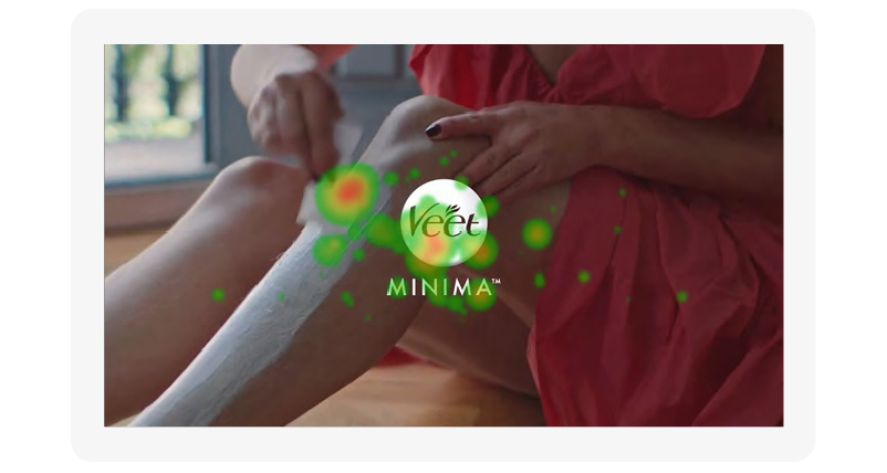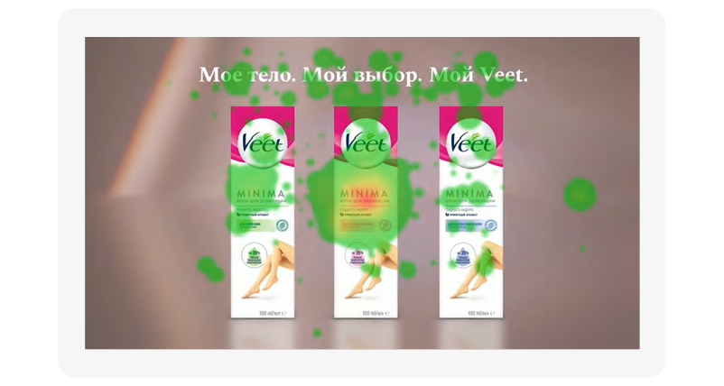 При этом сам логотип демонстрируется на размытом фоне в тех же серых тонах и практически сливается со стеной. Как видно на тепловой карте, его почти никто не заметил. Зато следующий показ логотипа очень эффективен — демонстрируются коробочки с кремом, где надпись уже на контрастном красном фоне. Демонстрируются три варианта упаковки и слоган.
