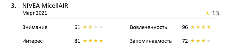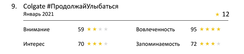 Зрителям запомнились ролики NIVEA MicellAIR, VICHY Mineral 89, Colgate #Colgate #ПродолжайУлыбаться и Антибуллинг-программа Head & Shoulders. Они набрали по 3 звезды.