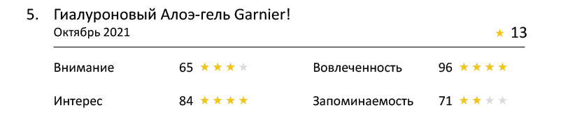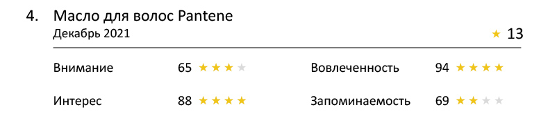 По этому показателю лидирует масло для волос Pantene — девушка в королевской короне не может не заинтересовать. Кто она, принцесса, королева красоты? Но и остальные ролики отстали ненамного. Семь из них набрали 4 звезды, еще 2 по 3 звезды.
