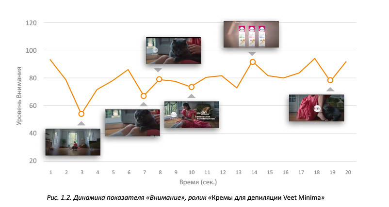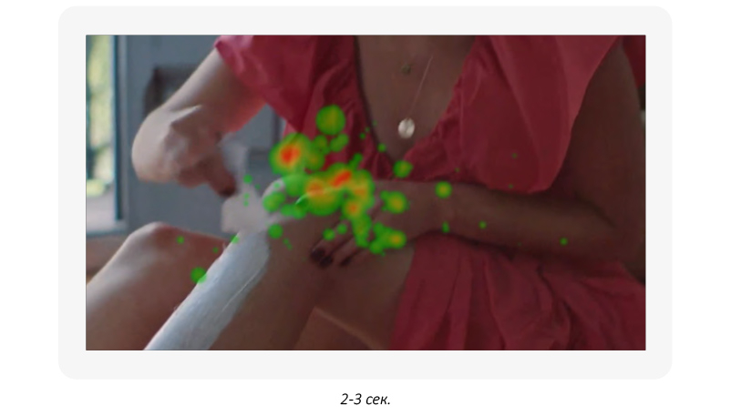 Первые кадры — нанесение крема для депиляции привлекает внимание, но вызывает скорее отрицательную эмоцию. Это понятно, ведь процедура депиляции не очень приятна. Наблюдается тенденция снижения внимания на фоне негативной эмоции.