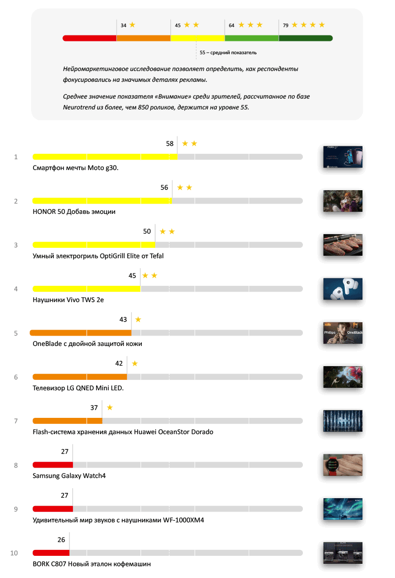 По этому показателю ни один ролик в зелёную зону не вошёл. Лидер — «Смартфон Moto g30» набрал 58 баллов. Ролик подчеркнуто технологичный — авторы не стали изобретать занимательный сюжет, а просто рассказали о самых ярких преимуществах нового телефона.