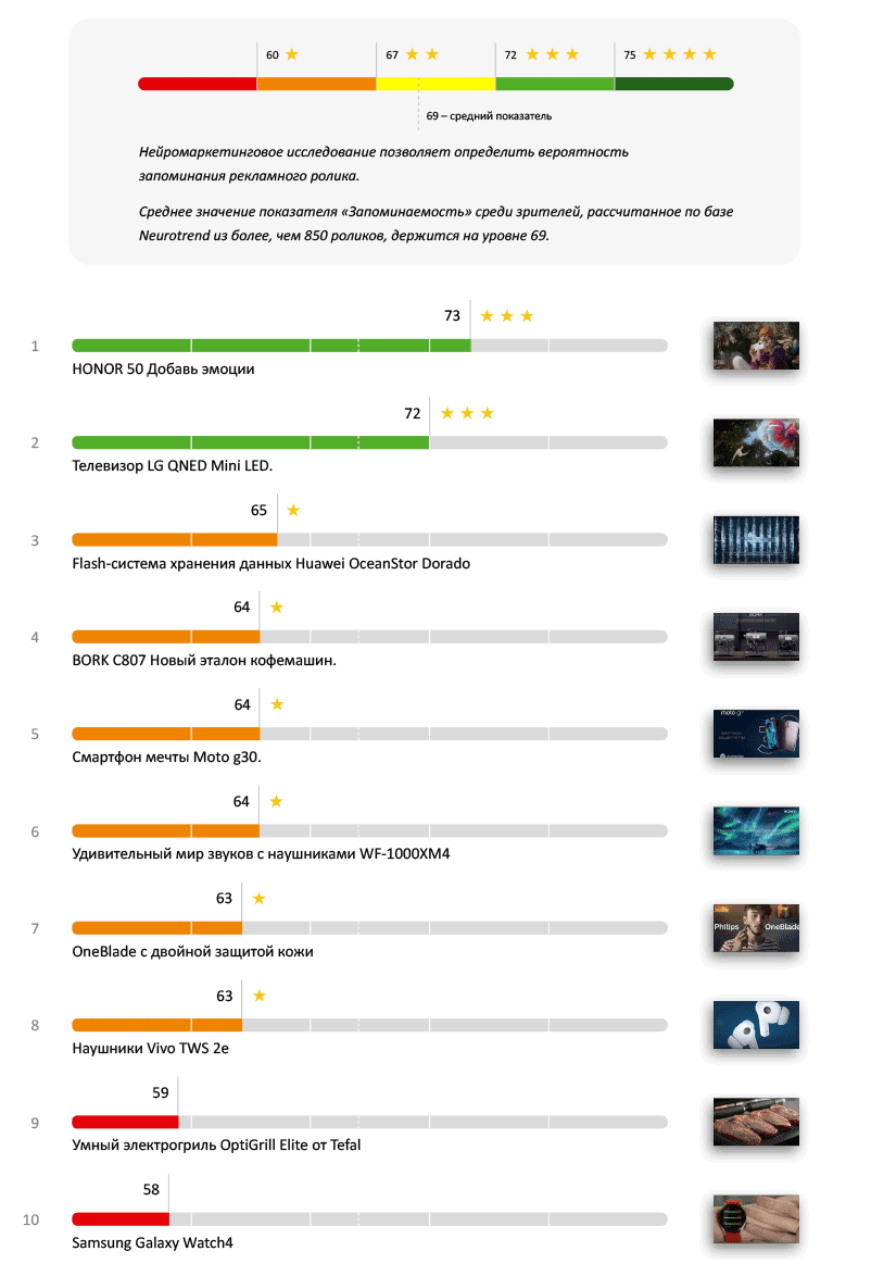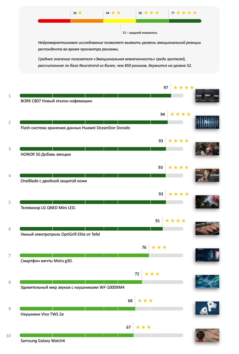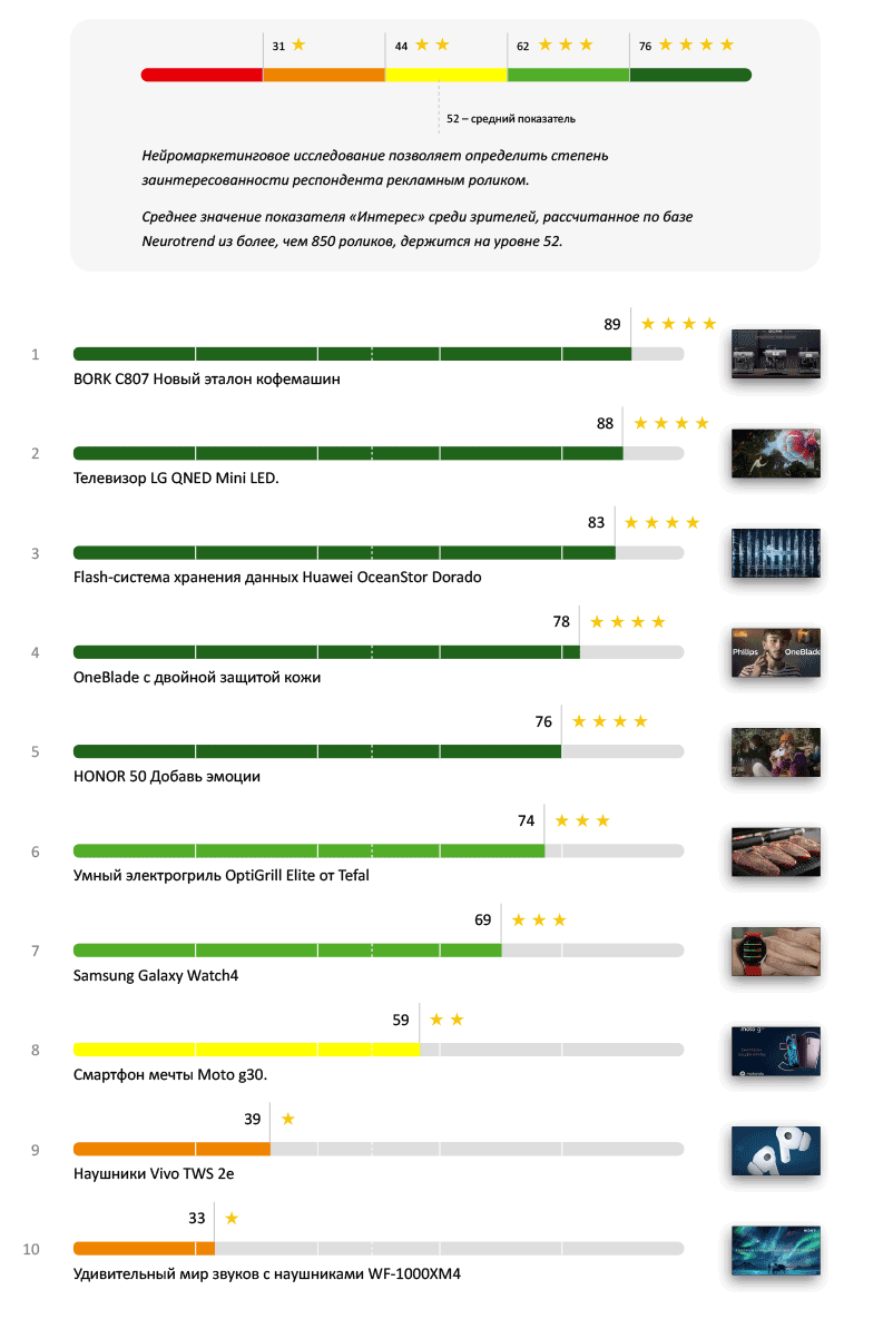 А вот здесь в зелёную зону попали только два из десяти роликов. Это «охотники на овец и оленей» — Honor 50 и «рыба в лесу» — телевизор LG QNED Mini LED. Лидер по предыдущим показателям, ролик с кофемашиной Bork, в середине рейтинга.