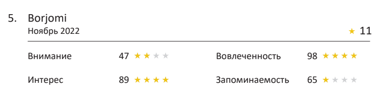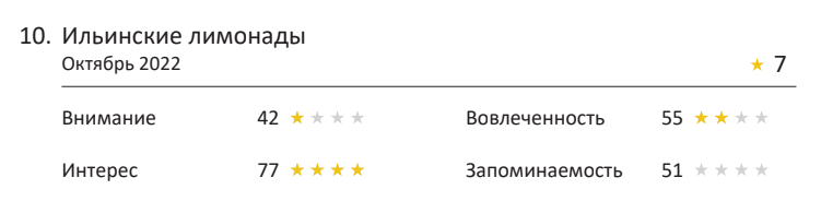 Почти все рекламные ролики в нашем рейтинге смогли эмоционально вовлечь зрителей, что подтверждается высокой оценкой по данному показателю — девять роликов вошли в зеленую зону. Однако, один из роликов получил лишь две звезды и почти в два раза по баллам отстал от большинства.