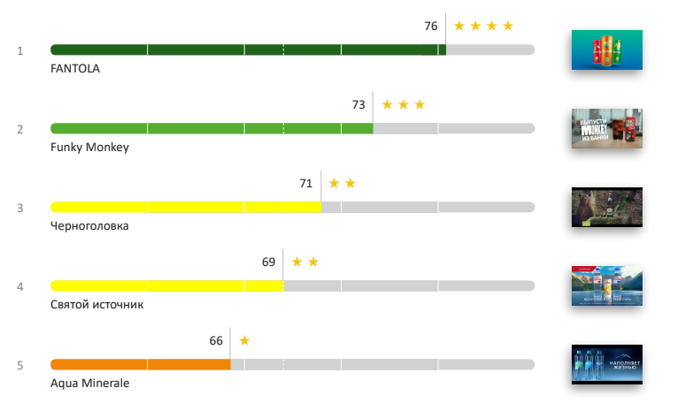 На первом месте с равным результатом оказались три рекламы напитков: природная ароматизированная вода Borjomi, кола от Funky Monkey и минеральная вода Aqua Minerale. У каждой рекламы свой уникальный сюжет и приемы, но все они смогли вызвать эмоции у зрителей.