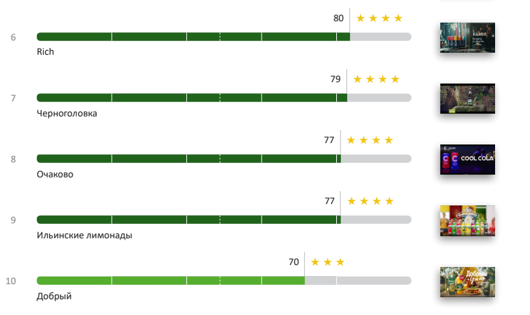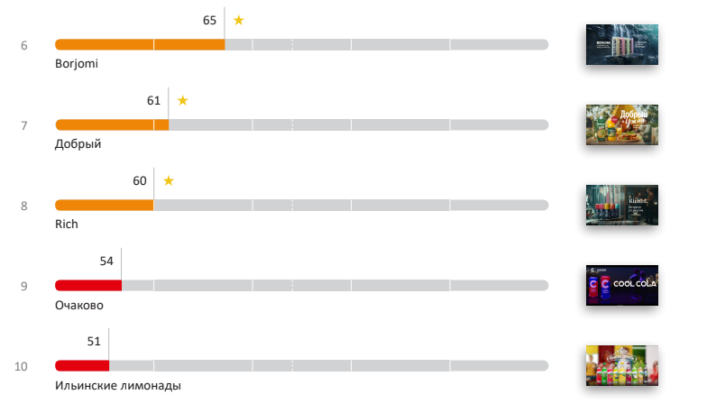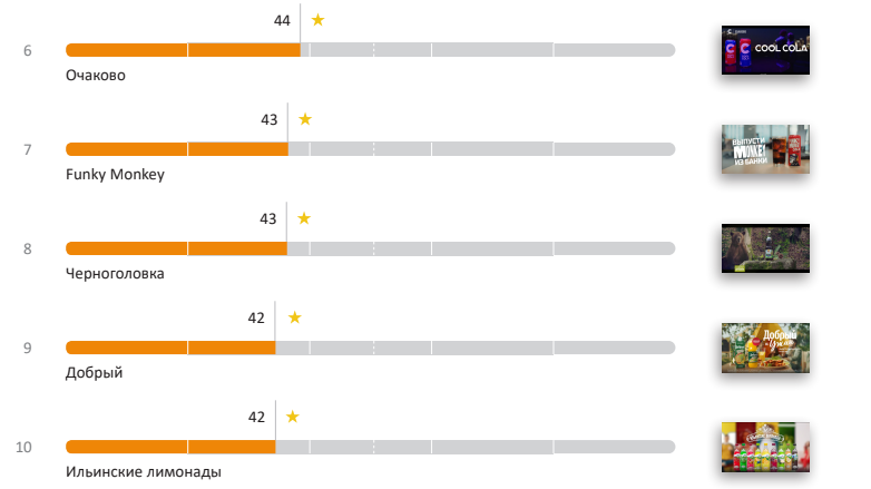 Наименее эффективными оказалась реклама от брендов «Добрый» и «Ильинские Лимонады» — они заняли последнее место, с результатом в 42 балла каждый.