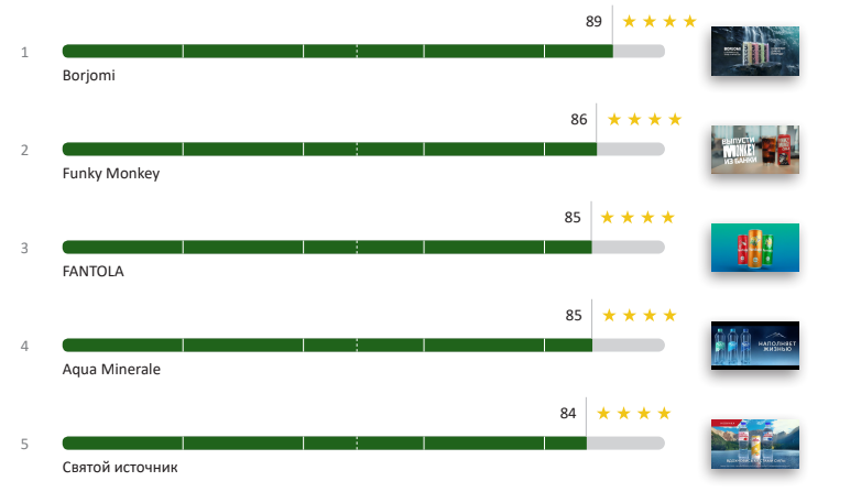 Ролики минеральной воды «Святой источник» и Borjomi заняли второе и третье места соответственно, несущественно отстав от победителя.