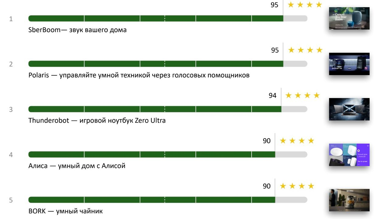 Лидирующее место заняли два ролика: первый рекламирует умную колонку SberBoom и акцентирует внимание на высоком качестве звука, второй демонстрирует умную технику Polaris и создаёт образ будущего, где всё в доме автоматизировано и управляется голосом.
