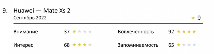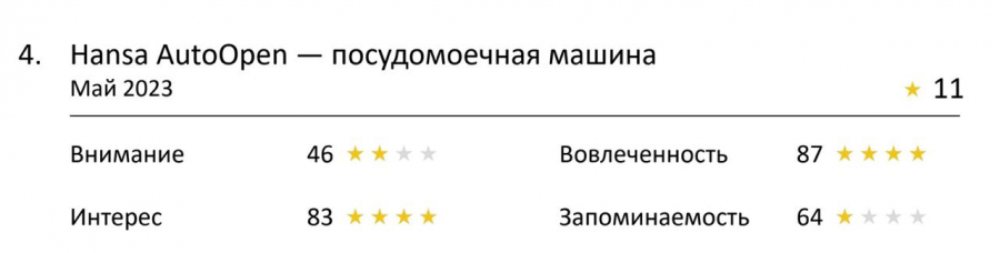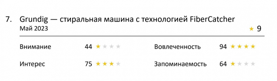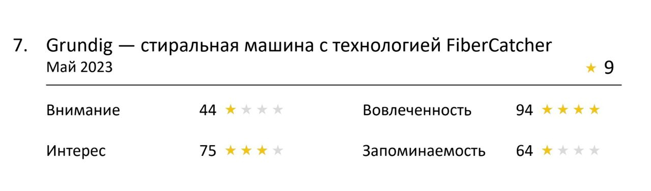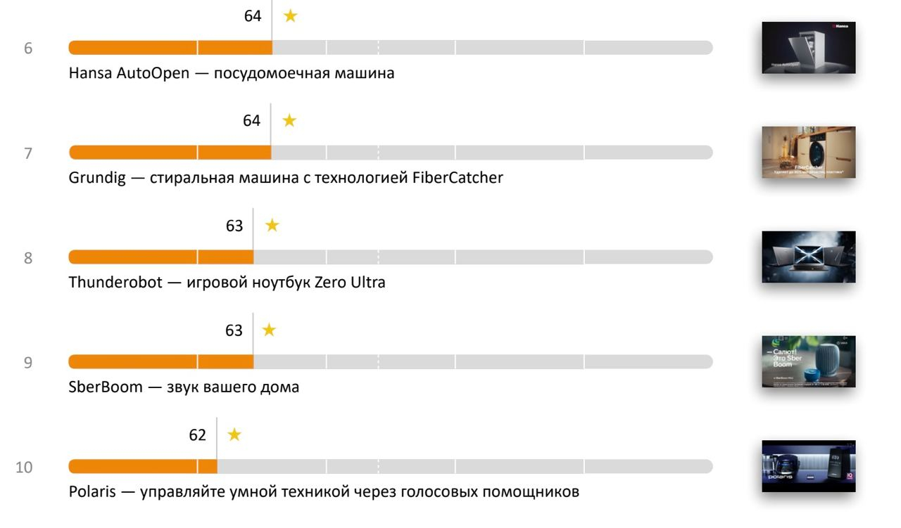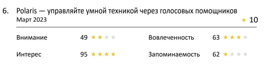 7 из 10 роликов получили всего одну звезду, и их оценки запоминаемости находятся в узком диапазоне от 62 до 65 баллов. Рейтинг замкнул рекламный ролик бренда Polaris, возможно, из-за большого числа умных устройств, представленных в ролике, они не запомнились зрителям достаточно хорошо.