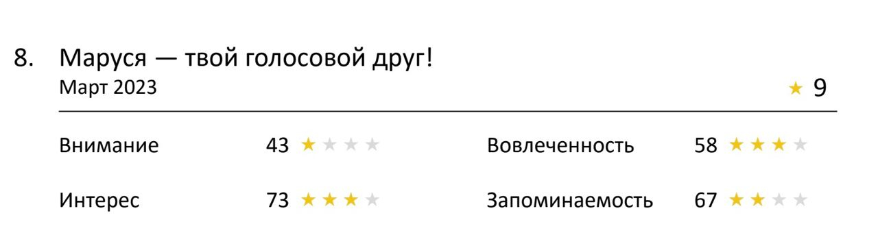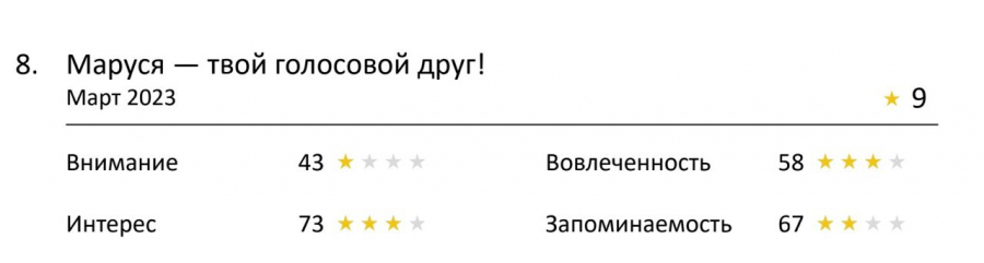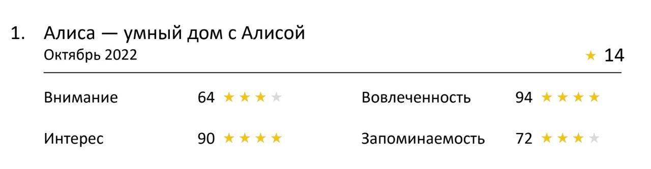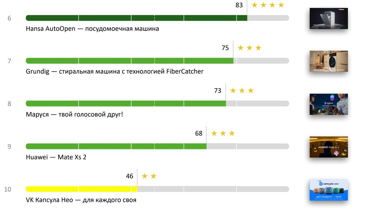 Первое место в рейтинге занял ролик, рекламирующий умную колонку и голосового помощника Алису. Эта реклама была оценена на 72 балла и три звезды, и это единственный ролик, который превысил среднее значение по показателю.