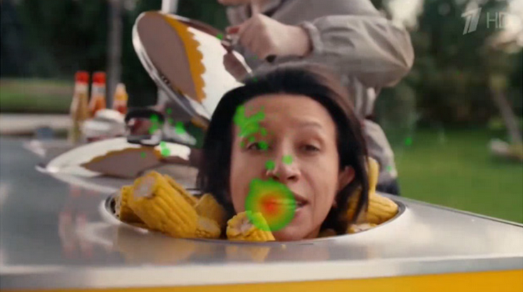 Как обычно, хорошо привлекают внимание известные, знакомые, эмоциональные лица. Появление лица известного человека, да ещё и в необычной обстановке привлекает внимание, так, например, и происходит в рекламном ролике «Яндекс Сплит», который стал победителем «Нейровизор сервисы», а произнесение ключевого слова «Сплит» заставляет зрителей смотреть на рот главной героини ролика Елены Борщевой.