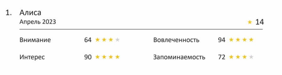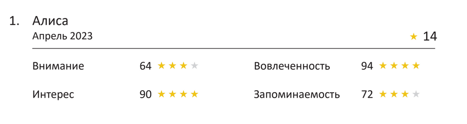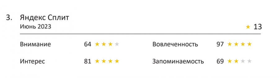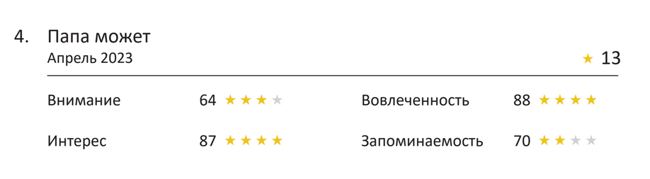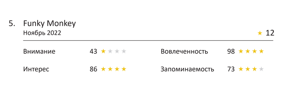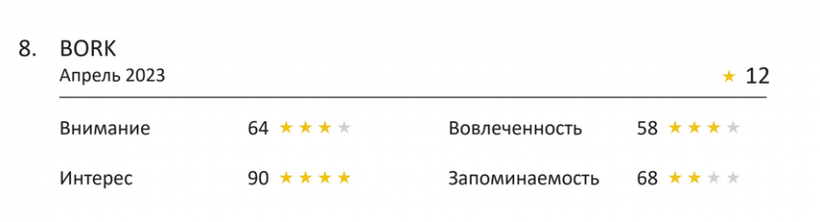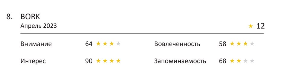 Все участники рейтинга смогли эмоционально вовлечь зрителей: семь из восьми роликов получили максимальные четыре звезды, за исключением рекламы BORK, которой было присвоено три звезды.