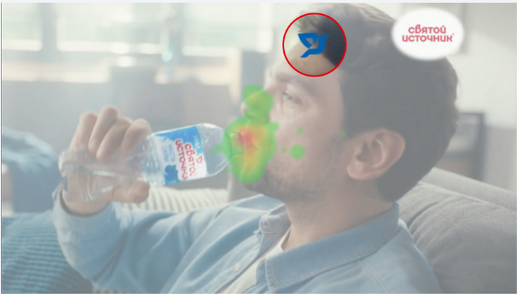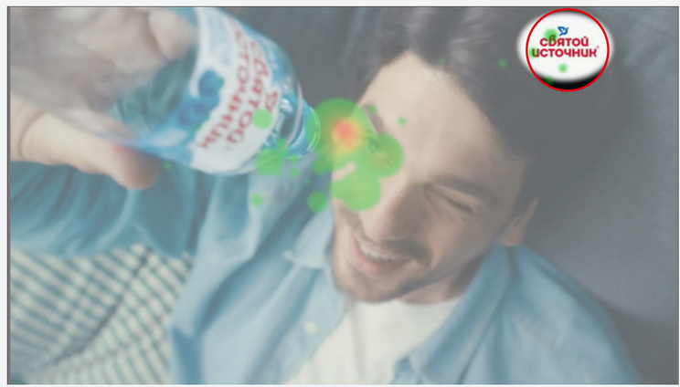 Здесь мы видим рассеивание внимания. Ни одну картинку зритель не успевает как следует рассмотреть, что видно на тепловой карте. За 15 секунд ролика в нем показаны 14 планов, во многих из которых есть движение, что усиливает нагрузку на внимание. Учитывая, что на пекшот и начальную заставку отводится четыре секунды, планы зрители разглядеть просто не успевают. Это приводит к низкому среди роликов — победителей показателю внимания.