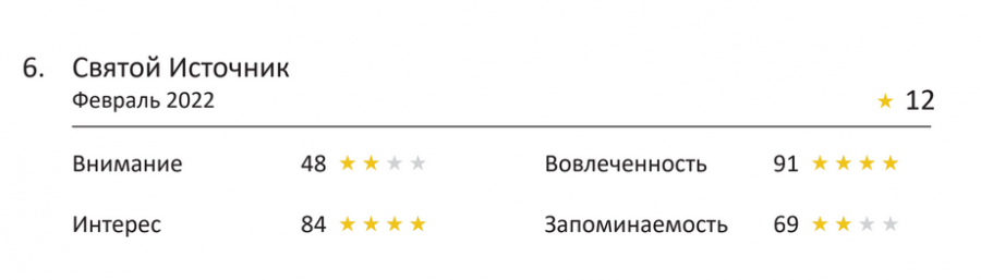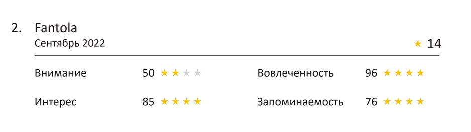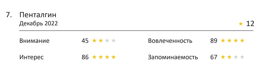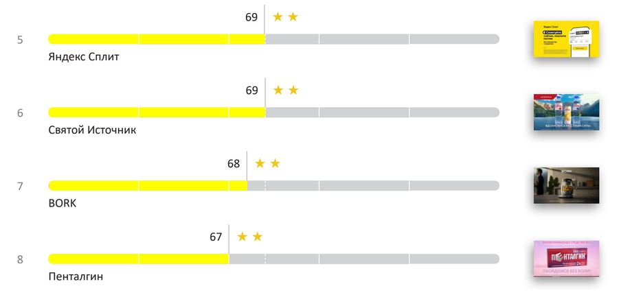 Остальные же рекламные видеоролики в рейтинге не сумели достичь среднего значения по показателю. Реклама брендов Fantola, «Святой Источник» и «Пенталгин» получила две звезды.
