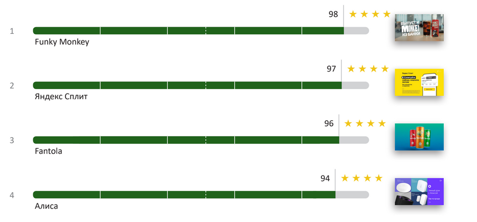 В «зелёной зоне» обнаружилась интересная тенденция: ровно половина рекламных роликов, представляющих различные сегменты, оценены одинаковым количеством баллов. Этими результатами смогли похвастаться продукты «Яндекса», такие как Алиса и «Яндекс Сплит», а также колбаса бренда «Папа может» и умный чайник BORK — каждый из них набрал по 64 балла.