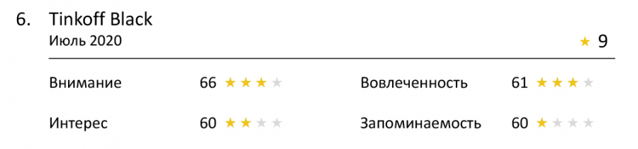 Топовая категория по данному критерию вновь пустует. Хотя получить четыре «звезды» никому не удалось, несколько роликов все же проявили себя лучше других — затронуть чувства и выделиться среди остальных получилось у рекламы «Альфа-Банка», «ВТБ», «СберKids» и Tinkoff Black. Все они заработали три «звезды» и вызвали довольно сильный эмоциональный отклик у зрителей.