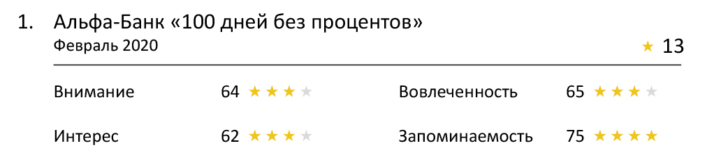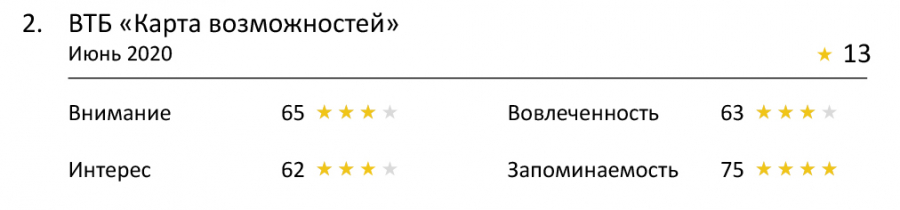 Топовая категория пополнилась — на это раз в ней оказались два ролика. Реклама карт «ВТБ» и «Альфа-Банка» продемонстрировала прекрасную запоминаемость и смогла заработать целых четыре «звезды». Всегда очень