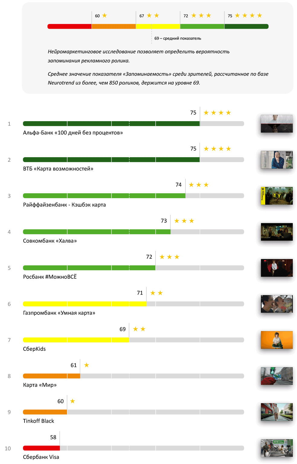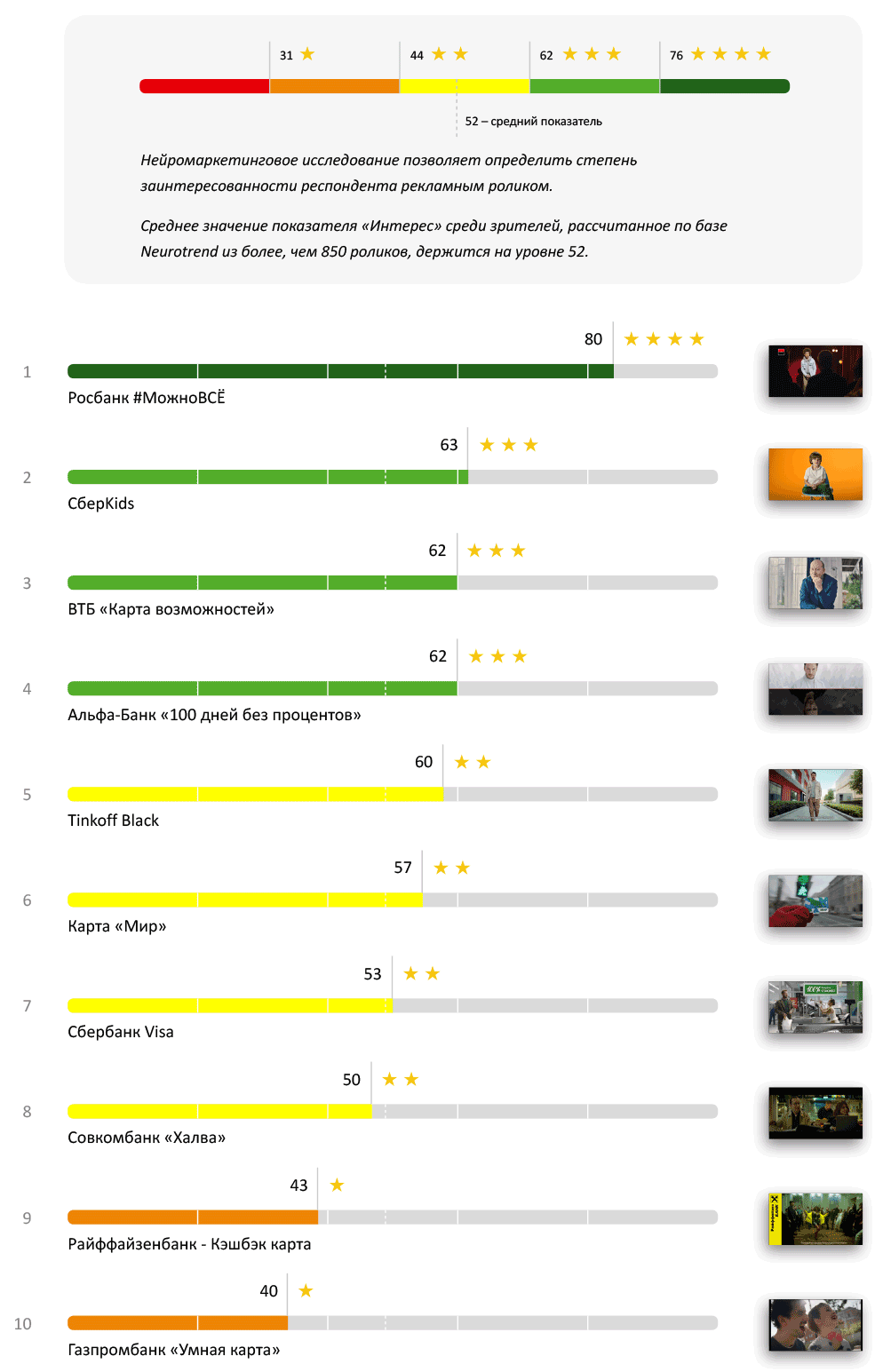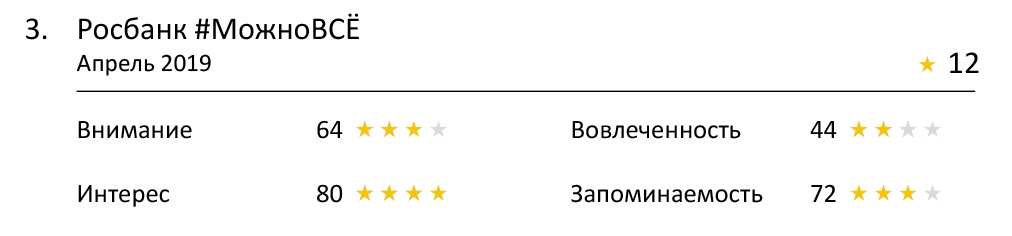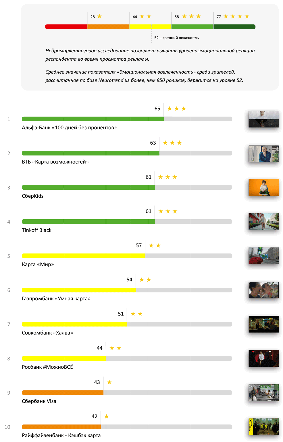 Остальная реклама из подборки максимальной оценки, к сожалению, не получает, но большинство средний результат показывает — значит, справляется довольно неплохо. Меньше всего баллов у «Райффайзенбанка» и «Газпромбанка» — их ролики получили всего по одной звезде, но при этом не попали в красную зону.
