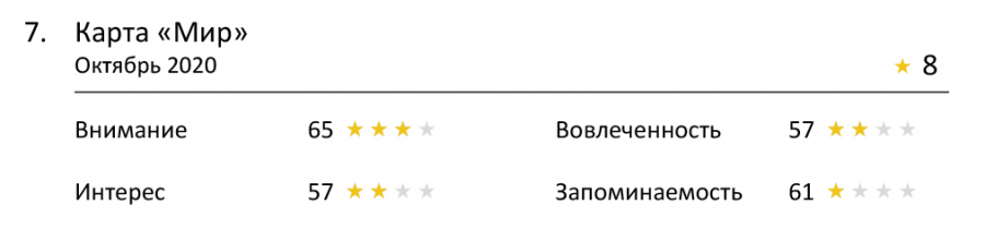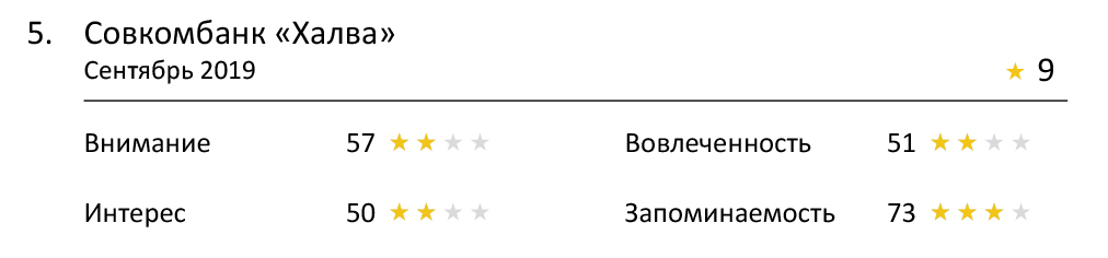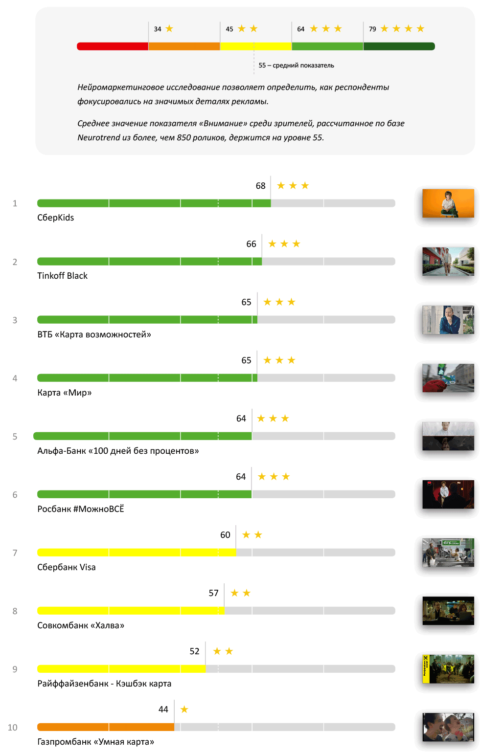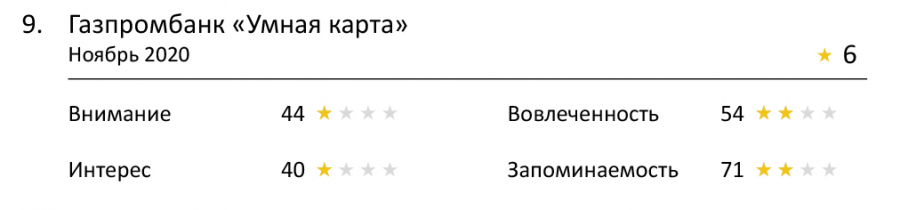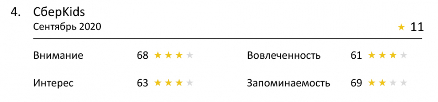 По результатам исследования, в новой подборке не оказалось рекламы, которая способна привлекать и удерживать внимание на высоком уровне. Поэтому ни один из претендентов не получает максимальной оценки. Ближе всех к четырем «звездам» оказался ролик «Сберkids», набравший 68 баллов, а хуже всех справилась реклама «Умной карты» «Газпромбанка».