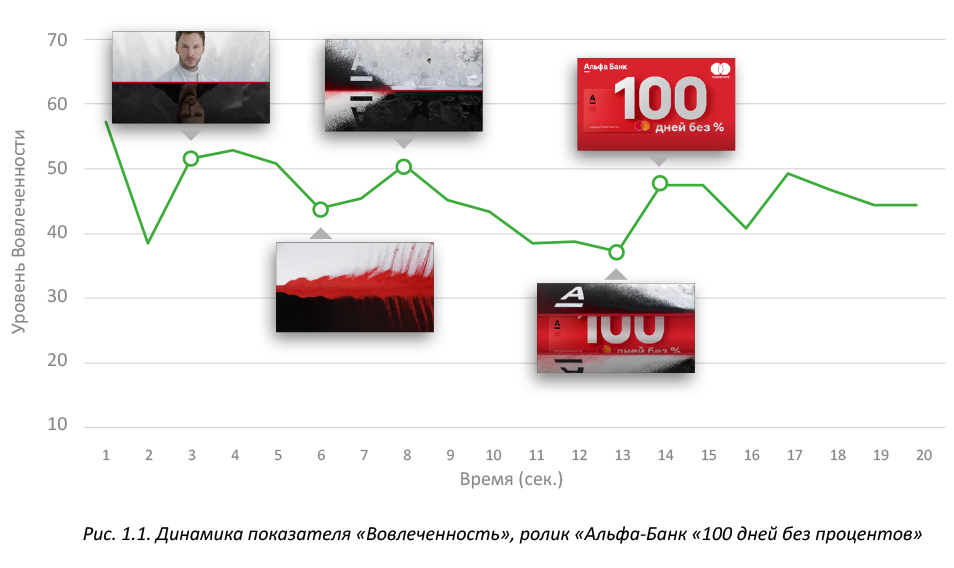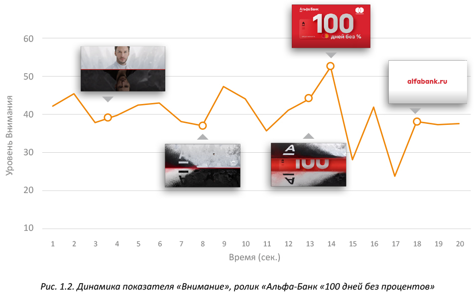 Поскольку у ролика нет как такового сюжета, его первая часть по смыслу слабо связана со второй, показатели интереса получились не очень высокими. Что же касается внимания, то его показатель проявил несколько ниже, чем мог бы быть, — фокус внимания отстает от движения, «пустая» (в смысле привлекающих внимание объектов) первая