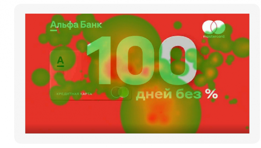 Здесь все, о чем может только мечтать рекламодатель: внимание уделяется названию банка, его логотипу и уникальности предложения. Но вот еще один интересный момент — на тепловой карте мы видим фокус внимания на слове «дней». Это значит, респонденты не просто скользили взглядом, а вникли в предложение.