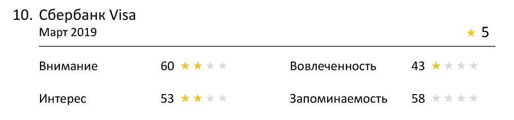 В сравнении с предыдущими показателями рейтинг по запоминаемости стал более разнообразным: появились как топовые лидеры, так и реклама в красной зоне. Впервые в этом обзоре один из роликов оказался без звезд — запомниться зрителям не удалось рекламе «Сбербанк Visa». На это стоит обратить внимание — запоминаемость влияет