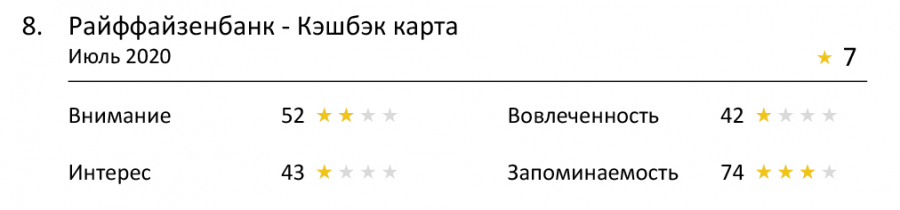Что касается нижней части рейтинга, то здесь ролику «Газпромбанка» удалось выбраться из оранжевой зоны. Но на этот раз в ней оказались «Сбербанк Visa» и «Райффайзенбанк — Кэшбэк карта». Эти ролики довольно слабо повлияли на зрителей и вызвали мало эмоций, поэтому получили всего одну звезду.