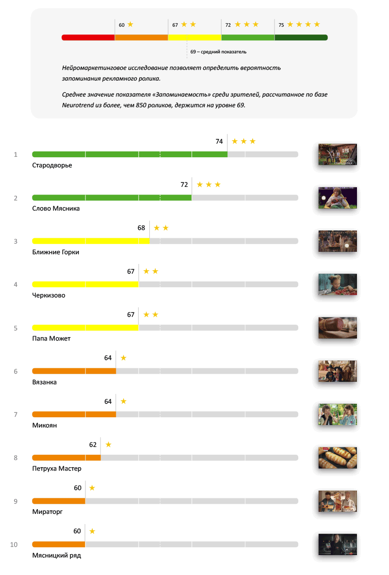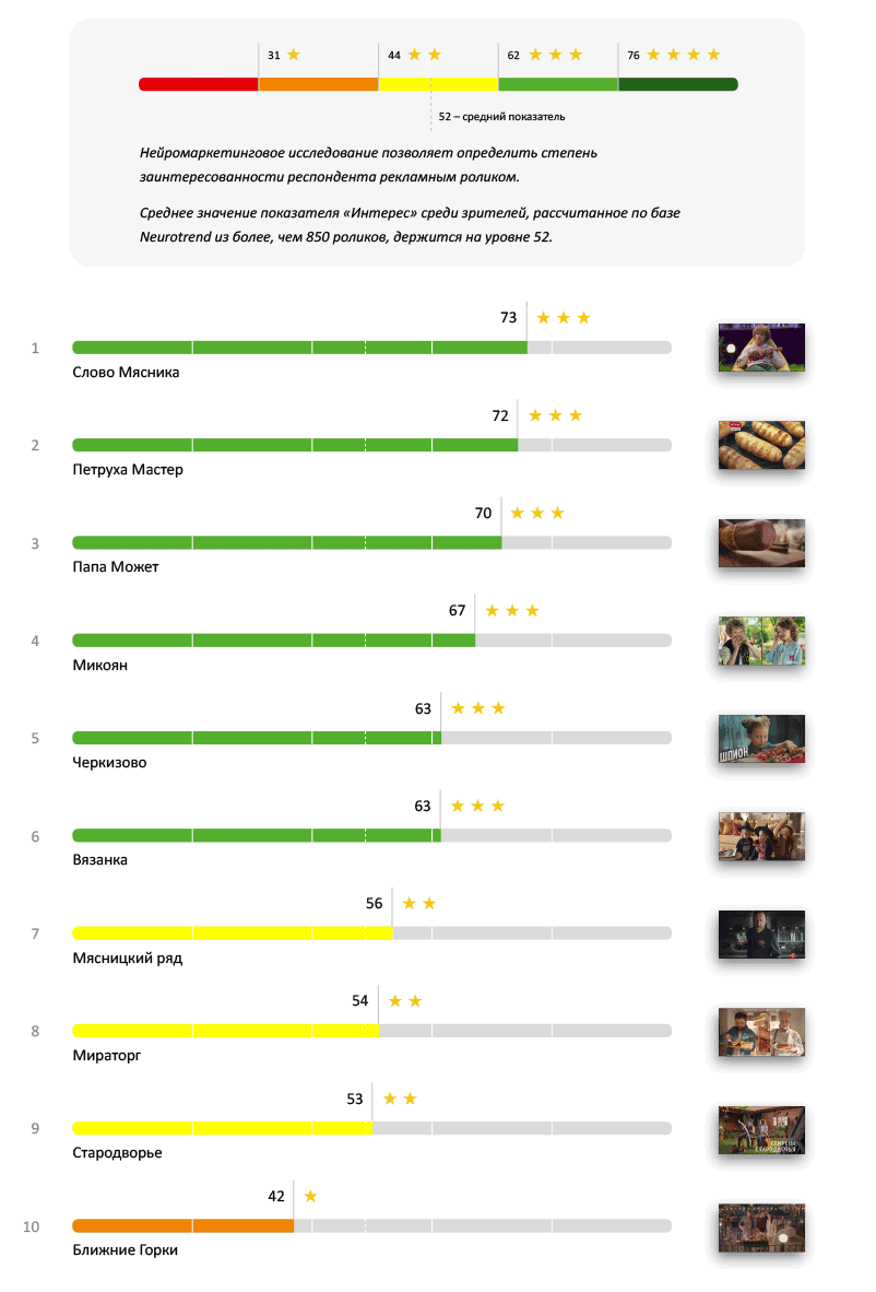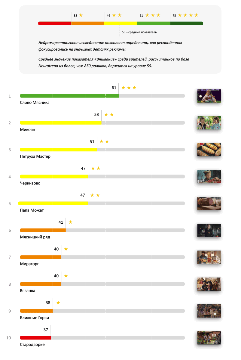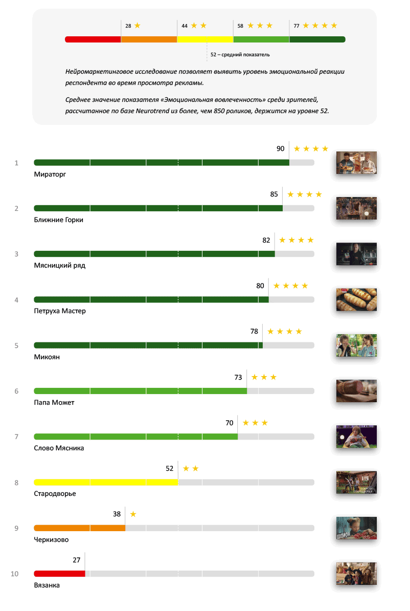 Если реклама вызовет эмоции — это может значительно повлиять на принятие решения о покупке при следующем походе в магазин. В этом рейтинге «Слово Мясника» впервые уступило свое лидерство, теперь на вершине топа оказывается «Мираторг». Он показал потрясающий результат, значительно перешагнув минимальный «четырехзвездочный» порог до результата в 90 баллов. Несмотря на то, что реклама «Вязанки» все же попала в красную зону, 70% подборки показало отличный результат.