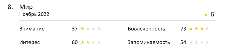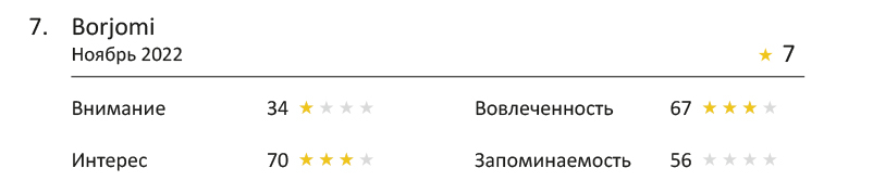 Прежде всего, следует отметить, что ролик короткий, а для коротких роликов (до 20 секунд) показатели запоминаемости в среднем несколько ниже, чем для 30-секундных, поэтому две звезды — хороший показатель запоминаемости для короткого ролика.
