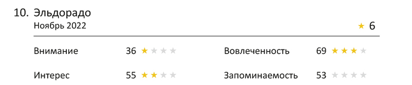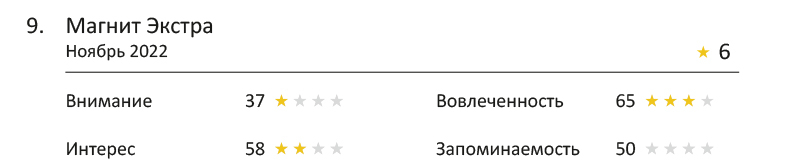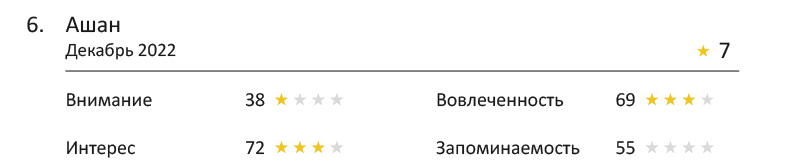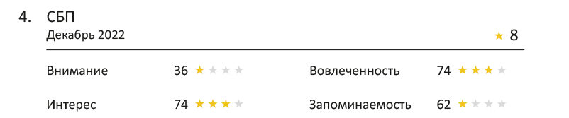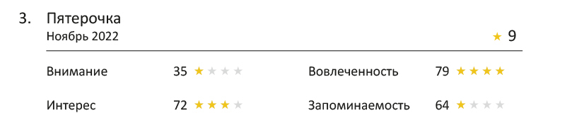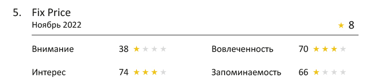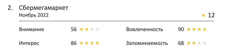 Хоть реклама яркая и интересная, но, к сожалению, плохо запомнилась зрителям. Только у Ozon получилось набрать баллы, которые превысили среднее значение по показателю — 71 балл. За ним следует реклама СберМегамаркета — 68 баллов. Fix Price, «Пятёрочка» и СБП получили 1 звезду.
