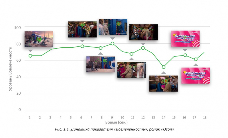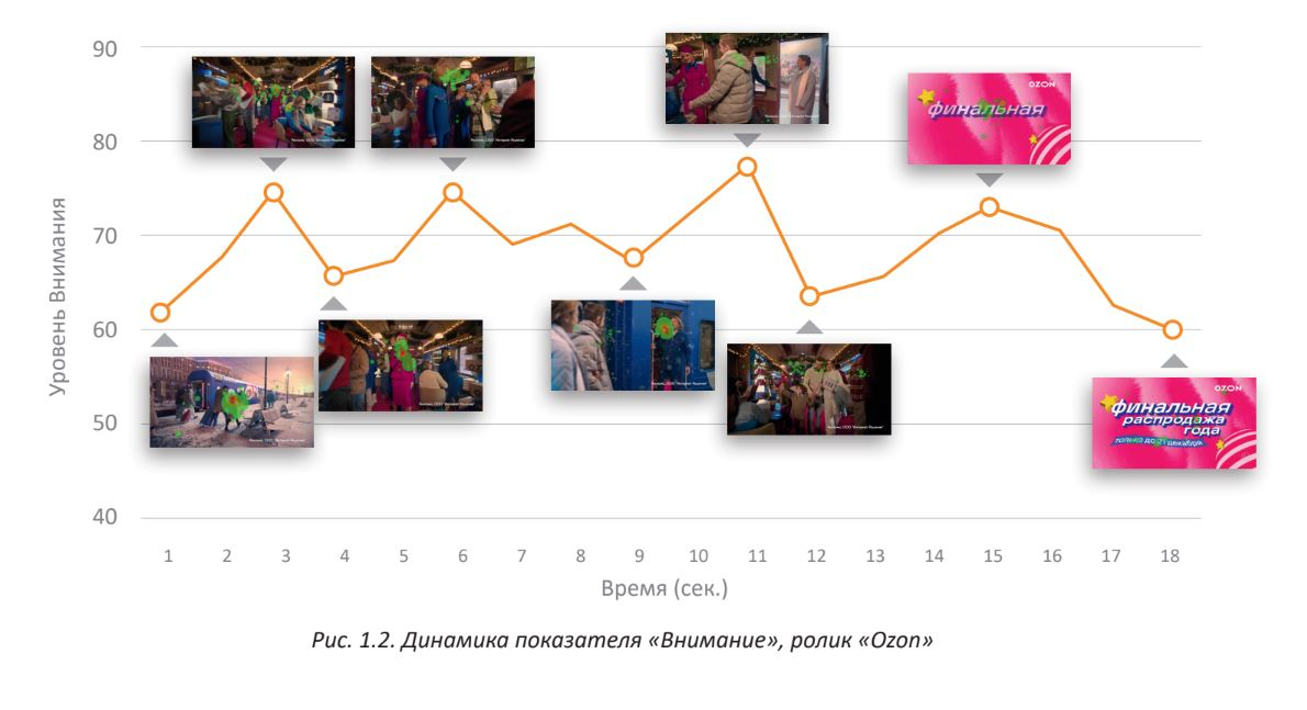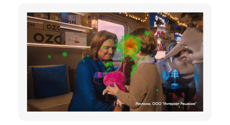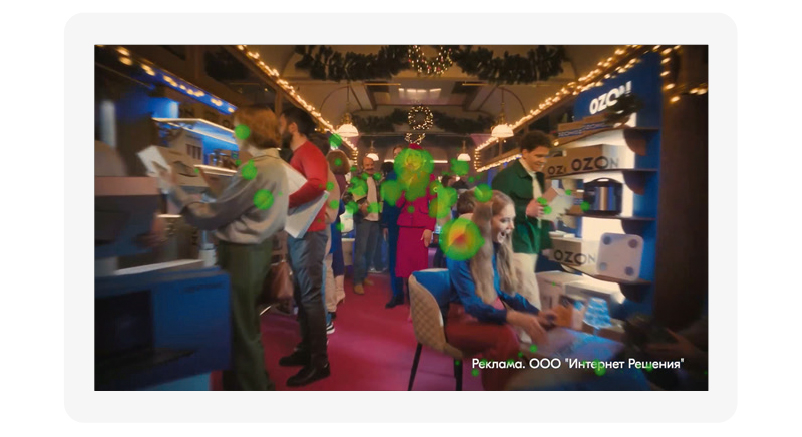 Однако достичь среднего значения получилось у рекламы Ozon и «СберМегамаркет», 63 и 56 баллов — это жёлтая зона. На это могло повлиять: динамичный сюжет, предновогодняя суета и музыка, как например, «СберМегамаркет» использовал песню ATC Around the world (2000 года выпуска) — это фактор сыграл на его стороне и привлёк внимание.