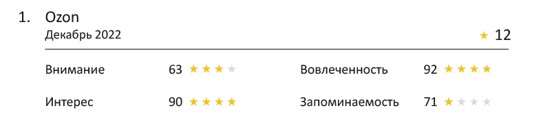 Заинтересовать зрителей у всех рекламных роликов получилось, так как среднее значение в 52 балла набрали все участники. Ещё одна победа за Ozon — новогодний поезд с подарками и финальная распродажа в нем «зацепили» зрителя.