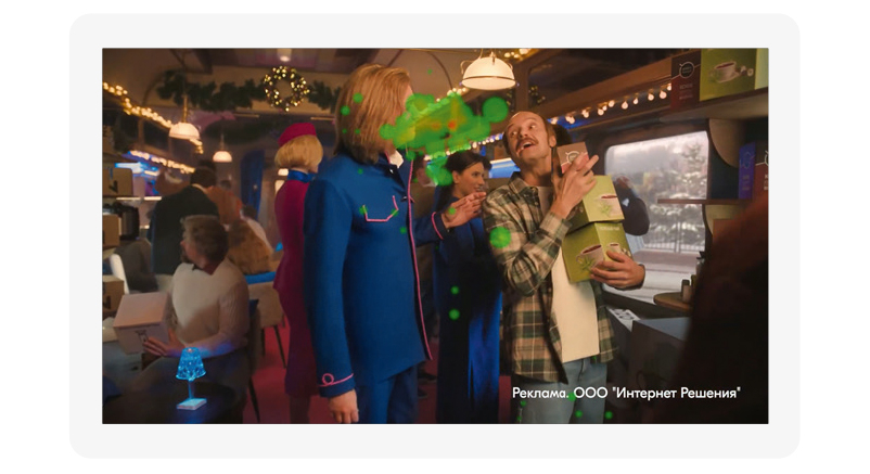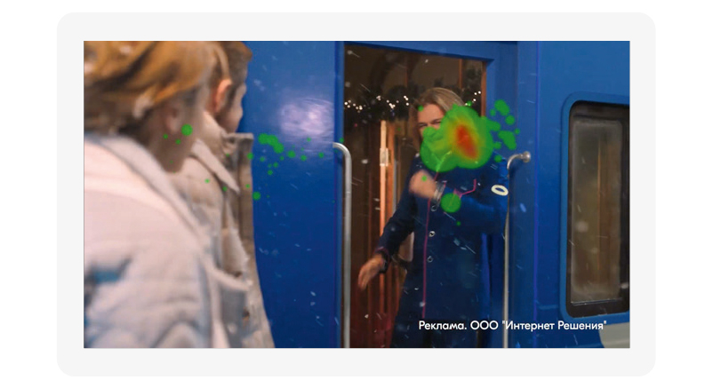 С самого начала зритель погружается в атмосферу праздничной суеты: все куда-то бегут, на платформе необычный поезд — это вызывает интерес и повышение эмоциональной вовлеченности. С 1 по 3 секунду идёт и рост когнитивного внимания.