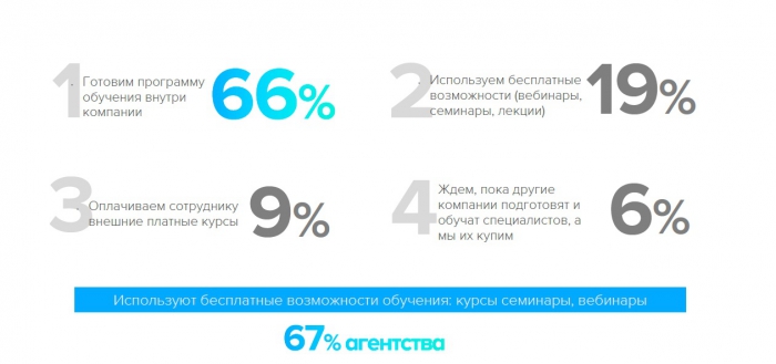 В то же время внешние курсы готовы оплачивать только 9% участников опроса. Бесплатные курсы и вебинары использует четверть компаний, и почти 70% из них – также агентства.