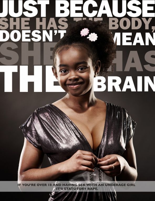 На принтах, которые скорее провоцируют на преступления, чем защищают от них, изображены маленькие девочки с телами взрослых женщин с большой грудью. Да и подпись «Просто потому, что у нее есть тело, не означает, что у нее есть мозг» оставляла желать лучшего.
