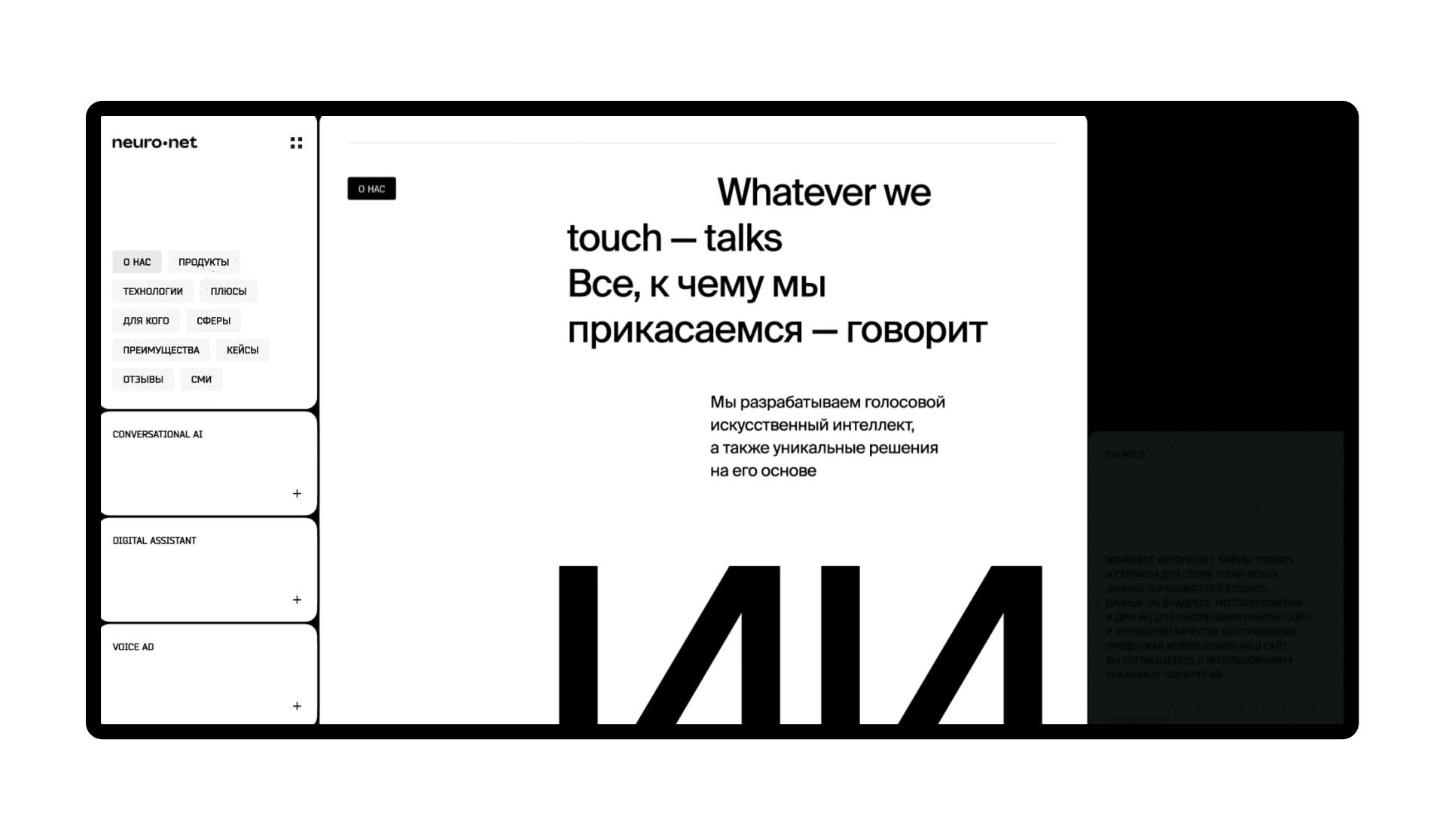Идея интегрировать человекоподобного голосового помощника на сайт пришла мне с первых дней, как я начал работать в Neuro.net. Сначала я разработал концепт и первые прототипы Product AI. Это когда продукт говорит от себя, рассказывая о себе и отвечая на вопросы покупателя, «как человек», и при этом выражает эмоции. Прототипы вызвали восторг у наших клиентов, и я решил позволить бренду/продукту продолжить разговор уже на домашней странице в интернете. В тот момент это решение стало сменой парадигмы в маркетинговых коммуникациях — мы позволили продукту говорить от первого лица. Команда Pixies сразу уловила, что мы, по сути, создаем новый формат коммуникации и поэтому предложила дерзкие дизайнерские решения. Коллеги из Pixies прекрасно справились с такой сложной задачей и смогли увидеть мир и голос ИИ нашими глазами.