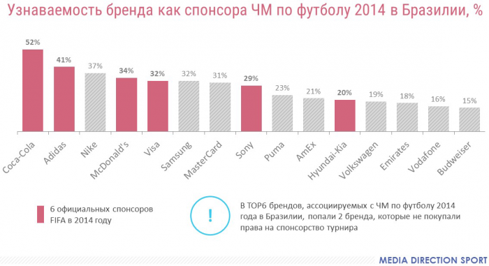 При этом использовать в своих коммуникациях те или иные спортивные события могут не только их официальные спонсоры. Так, нестандартные проекты ambush-маркетинг компаний, не являющихся партнерами Чемпионата Мира по футболу 2014 в Бразилии, были настолько успешны, что в топ-10 рейтинга брендов по узнаваемости в качестве спонсора ЧМ попали 5 компаний, не имевших официальный статус партнера этого события. Среди них - Nike, Samsung, MasterCard, Puma и AmEx.