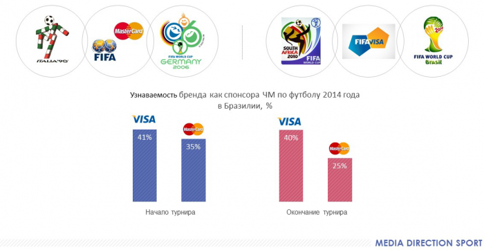 Хотя, есть и исключения. Пример - MasterCard и VISA. Несмотря на то, что после Чемпионата Мира 2006 года MasterCard перестал быть спонсором FIFA, знание MasterCard в 2014 было незначительно ниже знания VISA. С одной стороны, MasterCard спустя длительное время оставил территорию для конкурента, с другой стороны, конкурент (VISA) начал инвестировать значительные средства в официальное спонсорство, а потребитель до сих пор считает спонсором MasterCard.