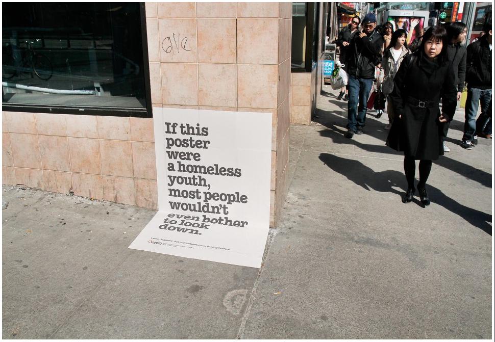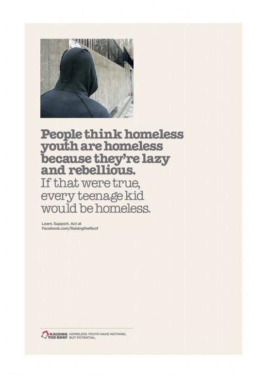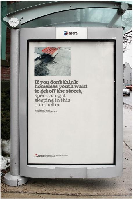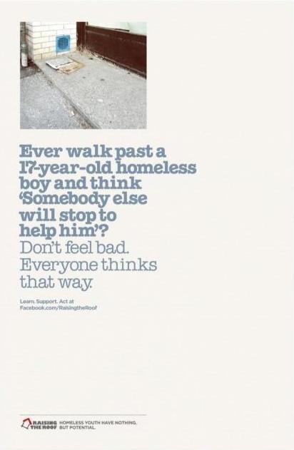Завершает десятку лучших outdoor-кампания, посвященная социальной проблеме отношения к бездомным людям. «Если 16-летний подросток испытывает проблемы – его обидели, поставили в сложную ситуацию – люди начнут его жалеть. Если аналогичная ситуация произошла с 16-летним бездомным – ему посоветуют найти работу», - гласят постеры, созданные креаторами из Leo Burnett Toronto для организации Raising the Roof.