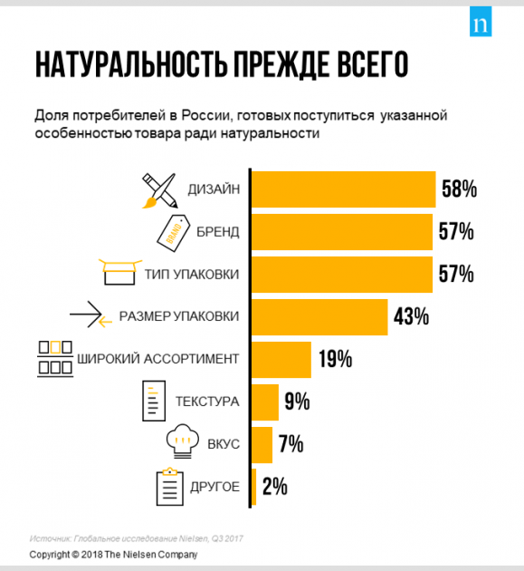 Аналитики отметили, что покупатели становятся все более внимательными и к составу продукта. В России 40% респондентов всегда читают информацию на этикетке перед покупкой и еще 49% иногда читают состав. При этом такие заявления на упаковке, как «полностью натуральный продукт», «органик», «свежий продукт» и другие, влияют на положительное решение о покупке у 29% опрошенных, а влияют в «некоторой степени» — у 55%. Наибольшим доверием пользуются такие надписи, как «свежий продукт», «низкое содержание натрия и солей», «низкое содержание сахара» и «низкая калорийность».