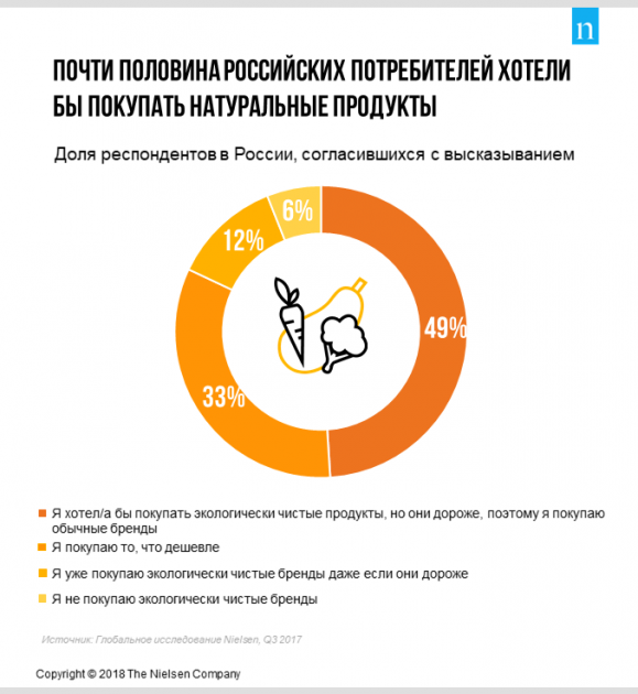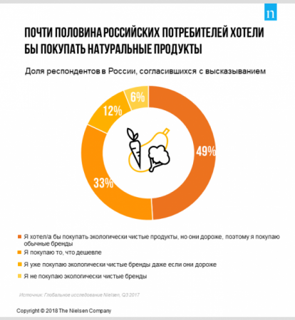 В России всего 12% респондентов приобретают экологические продукты. При этом российский показатель — один из самых низких и сопоставим с показателями таких стран, как Эстония (9%), Венгрия (10%), Израиль и Литва (по 11%). В то же время в Китае, Вьетнаме и Индии самые высокие проценты покупок «чистых» товаров — более 50%.