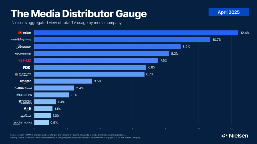 Paramount занял третью позицию, увеличив долю просмотра до 8,9%, благодаря росту аудитории на телеканалах CBS. Компания показала самый значительный месячный прирост среди медиагигантов, обойдя по этому показателю YouTube. Четверку замыкает NBCUniversal с долей 8,2%. Медиакомпания немного улучшила свои показатели по сравнению с мартом.