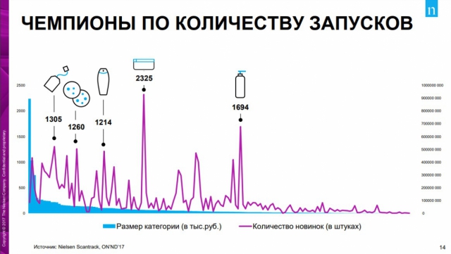 «Действительно, количество новых или обновленных продуктов, выведенных на рынок всего за один год, огромно. Подсчеты Nielsen при этом выявили, что 79% продаж от всех новинок были обеспечены всего тремя процентами новых запусков. Среда высококонкурентная, и производителям становится все важнее просчитывать каждое действие при запуске новинки — начиная от выбора идеи, заканчивая дизайном упаковки», — комментирует директор практики «Запуск новых продуктов» в Nielsen Россия Елена Самохина.
