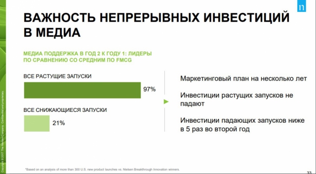 Согласно анализу Nielsen более 50 новых продуктовых запусков на рынке США (репрезентует 300 запусков), как правило, на второй год после выхода падают продажи более половины новинок, на третий год — 69%. Важно стимулировать первую покупку во втором году после старта: ее должны покупать впервые не менее 80% от уровня первого года. Для этого рекламные затраты во втором году должны оставаться на уровне первого.