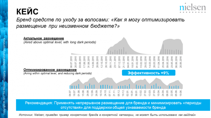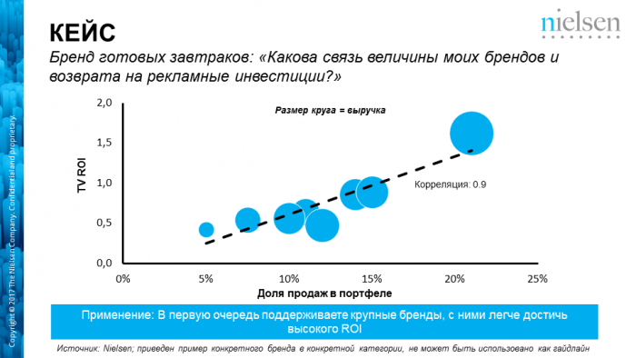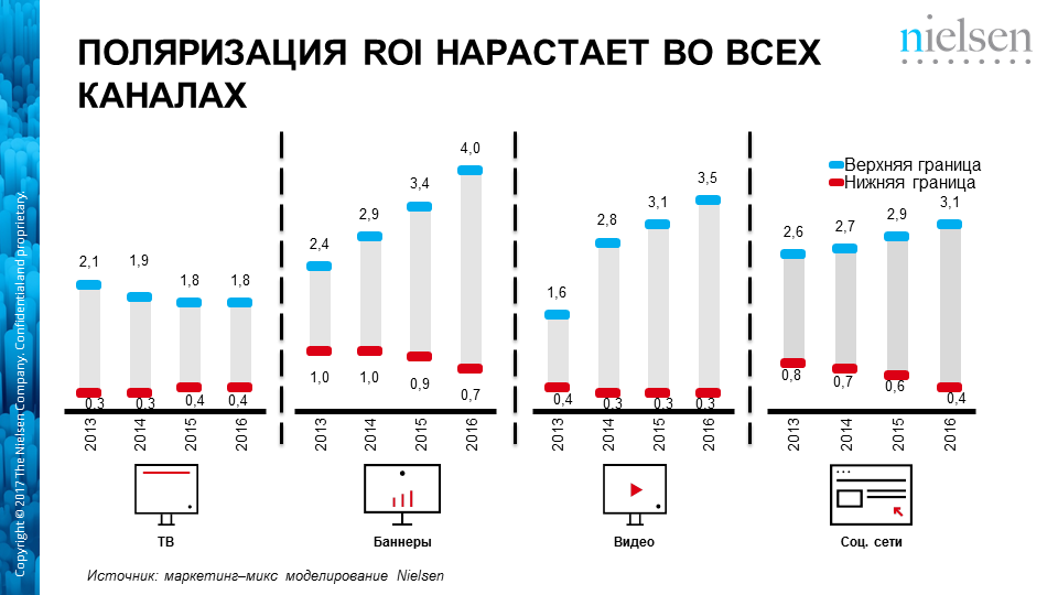 Практика моделирования маркетингового микса Nielsen показывает: разброс показателя возврата на инвестиции (ROI) в рекламу с каждым годом увеличивается. Это касается всех каналов - телевидения, видеорекламы, рекламы в социальных сетях, наружной рекламы и пр. Это означает, что компании, которые делают какую-либо рекламу, все больше рискуют не получить достаточного прироста продаж по итогам рекламных мероприятий.