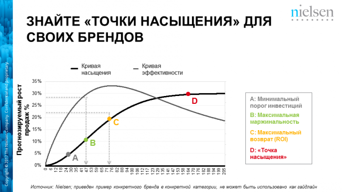 Каждый следующий шаг в наращивании GRP приводит к неравномерному подъему продаж. Представив себе вертикальную ось как прирост продаж, а горизонтальную – как количество GRP, каждый бренд может построить свою кривую, которая, как правило, будет иметь сначала восходящую форму, затем резко нисходящую. Именно в «переломной» точке наступает момент достаточности инвестиций, и дальнейшее наращивание GRP приведет к существенно меньшему приросту в продажах, а значит, такие инвестиции перестанут быть эффективными.
