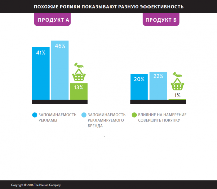 Мы проверили эксперимент и сравнили эффективность двух идентичных роликов в категории шампуней по методике Nielsen TV Brand Effect. При максимальной схожести сюжетов, последовательности кадров и даже образов героев, эффективность ролика А была оценена выше, чем эффективность ролика Б (см. рис. 1). Нетрудно догадаться, что фактором, определившим успех ролика, стало размещение.