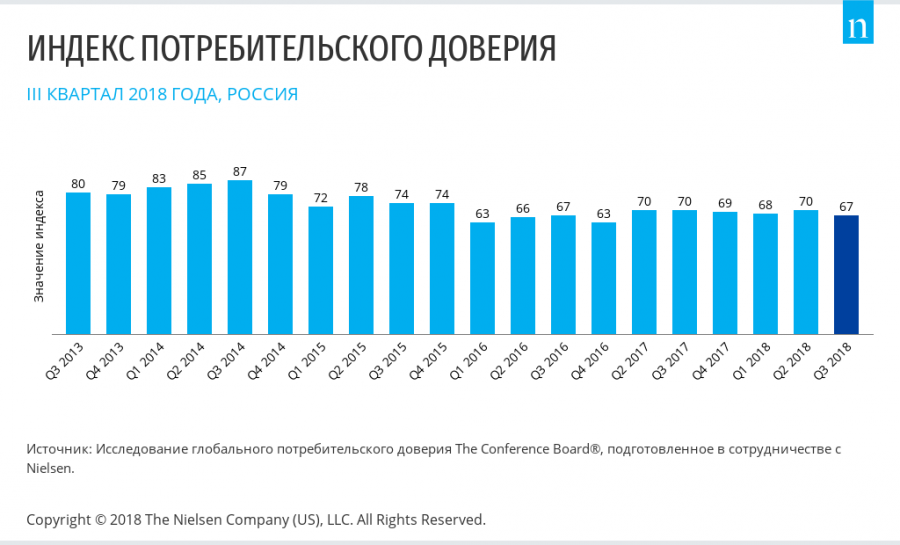 Индекс потребительского доверия россиян в третьем квартале 2018 года опустился на три пункта относительно второго квартала года. Из трех показателей, на основе которых складывает индекс — оценка потребителями перспектив на рынке труда, уровня финансового благополучия и готовности тратить деньги, — два ухудшились, следует из глобального исследования потребительского доверия The Conference Board, подготовленного в сотрудничестве с Nielsen.