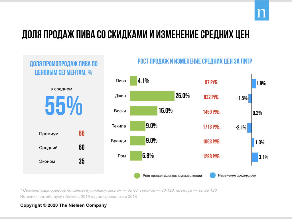 Вместе с тем аналитики зафиксировали рост средних цен на пиво. Стоимость литра увеличилась в 2019 году на 1,9%, до 97 рублей, причем основной вклад в рост цен внес премиальный сегмент. В ответ на эту тенденцию ритейлеры стали предлагать более дорогие напитки со скидкой: в натуральном выражении 55% пива продается по промо, тогда как в премиальном сегменте этот показатель достигает 66%.