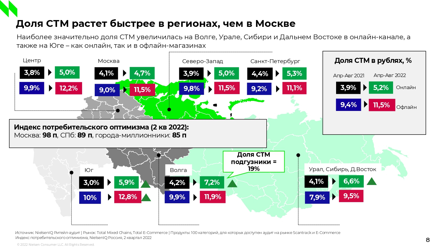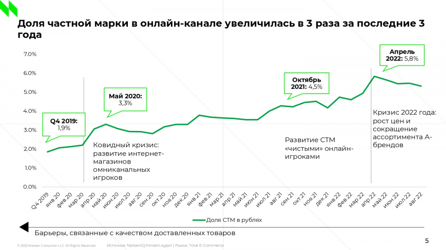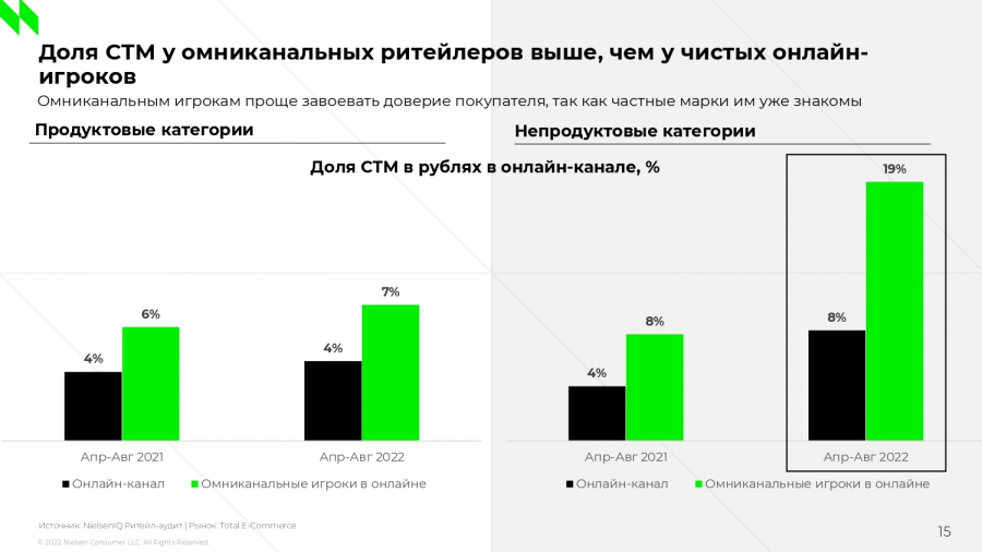 На рынке электронной коммерции существуют все предпосылки для дальнейшего развития СТМ, которые усиливаются за счёт ухода ряда крупных зарубежных брендов и переключения потребителей на локальные продукты, указывают аналитики NielsenIQ.